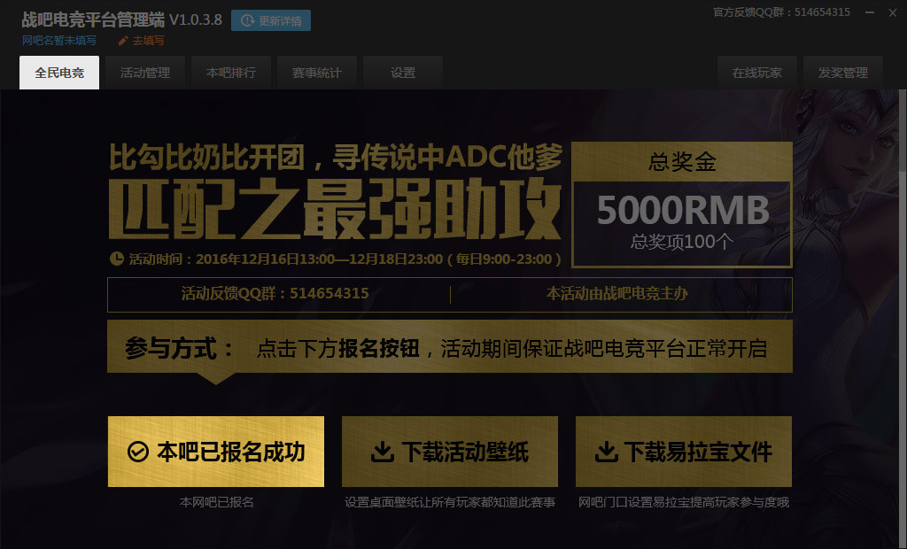 2、再点击页面中的【报名活动】按钮,可选择下载活动壁纸和易拉宝文件更快速吸引玩家。请多关注全民电竞页面,战吧电竞平台长期举办各类赛事