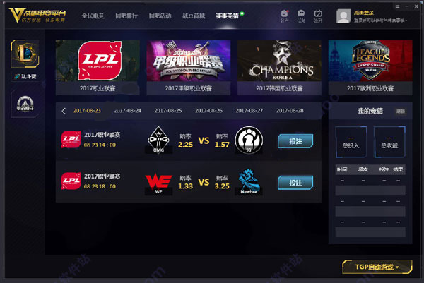 光看比赛不够刺激?那为何不来战吧电竞平台赛事竞猜专栏来一场押注竞猜呢?正所谓“搏一搏,单车变摩托”,战吧电竞平台除了有丰富多样的个人赛之外,还提供英雄联盟各大赛事押注竞猜,玩家在界面选择押注队伍、押注金额,就可以安心的观赏比赛啦。等待比赛结束后,就会惊喜的发现战豆又增加了不少哦。