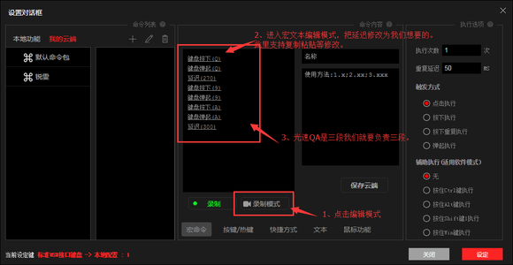 第六步:Q9A的宏的延迟是不对的,我们要进行修改。点击编辑模式按钮,进入编辑模式,修改其中的延迟。