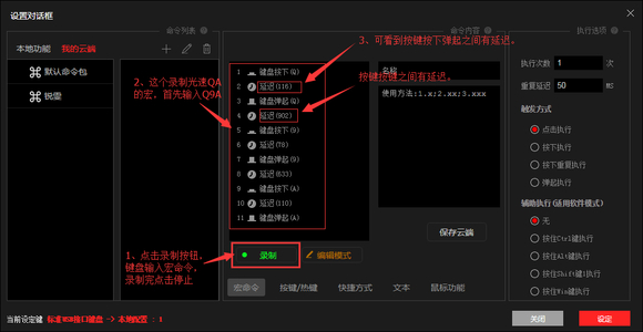 第五步:录制宏命令。以光速QA为例。我们先点击录制按键,键盘按下Q9A(9为大笑),然后点击停止,此时我们就录入了Q9A的宏。