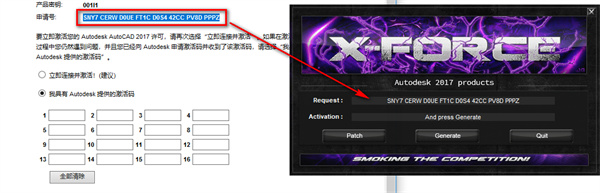 7、将“申请码”复制到注册机的第一项中,点击“Generate”,生成激活码;