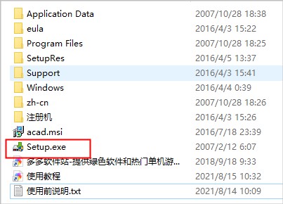 1、在本站下载软件压缩包,解压得到autocad2008 32位简体中文版源程序和注册机,点setup安装;
