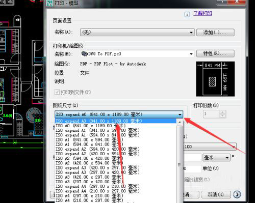 4、在打印机/绘图仪名称选择三角符号,选择PDF.pc3类型。