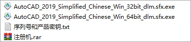 1、下载解压,得到32位和64位autocad2019简体中文版,以及注册机序列号和密钥;