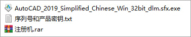 1、下载解压,得到autocad2019 32位简体中文版,以及注册机序列号和密钥;