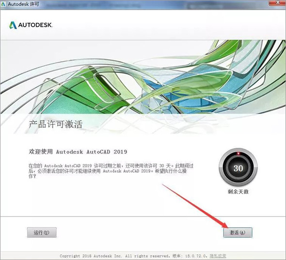 8、下面将进入AutoCAD 2019激活界面,点击运行的话就是使用30天的,我们要用注册机来激活,点击激活按钮