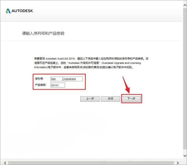 9、输入AutoCAD2019的安装产品序列号和密钥,666-69696969,001J1