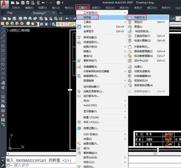 3、点击菜单栏的【工具】,点击【选项板】,点击【功能区】,关闭功能区;