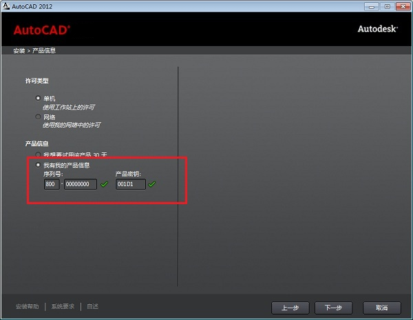 6、输入cad2018 64位序列号“800-00000000”,输入密钥“001J1”