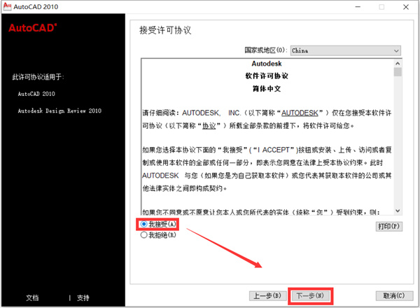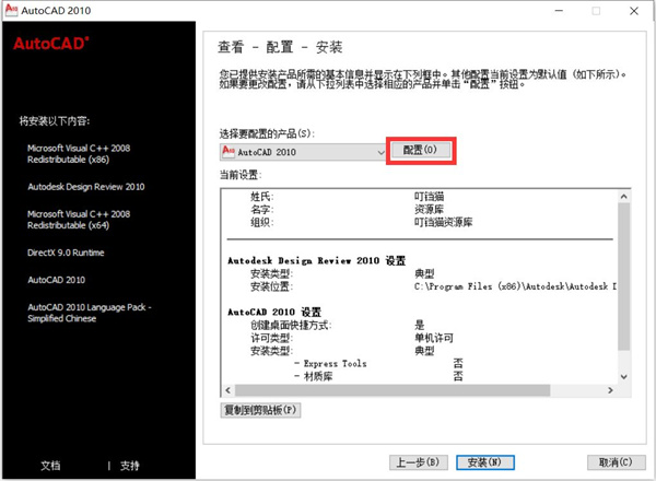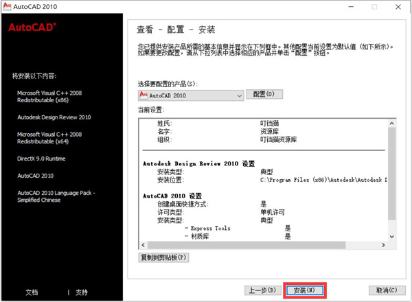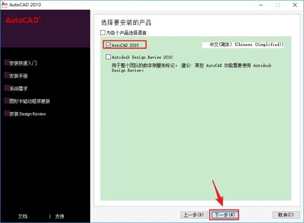4、默认只安装autocad 2010,autodesk design review 2010可以根据自身的需要选择安装;