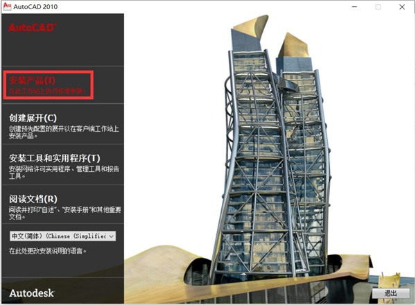 1、下载解压缩,即可获得autocad2010 32位安装包及注册机,首先双击exe文件开始安装;