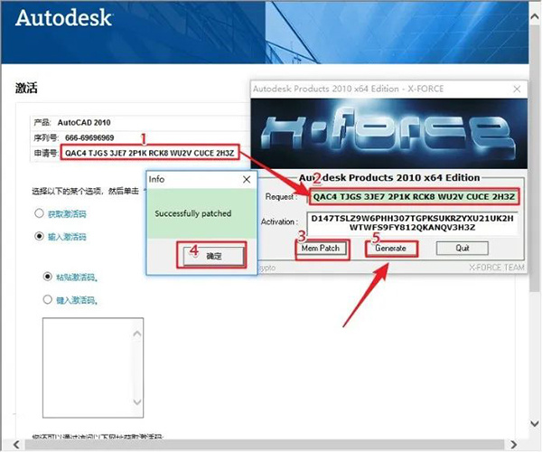 15、这时打开软件包中的autocad2010注册机,将申请号复制到“request”框中,点击“Generate”按纽得到激活码;
