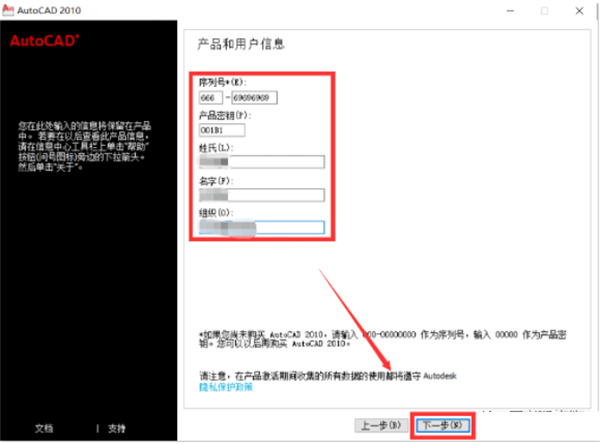6、输入autocad2010的序列号和密钥;使用下列序列号:356-72378422,666-69696969, 667-98989898,400-45454545或653-12354321等任意一个产品序列号,产品密钥一律为001B1;