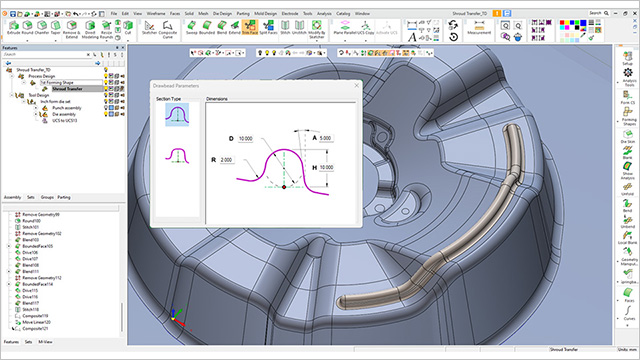 4、模具设计师现在可以轻松构建三维拉丝模几何形状,以便在拉丝操作过程中控制材料流动,从而实现无裂纹和皱褶的最佳零件成型。新例程将根据截面类型生成拉拔珠,并自动将结果混合到粘结面中。