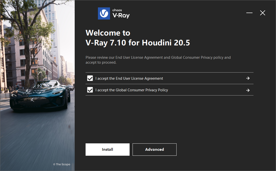 2、双击文件vray_adv_71000_houdini20.5.exe开始安装,勾选接受协议,点击ADVANCED;