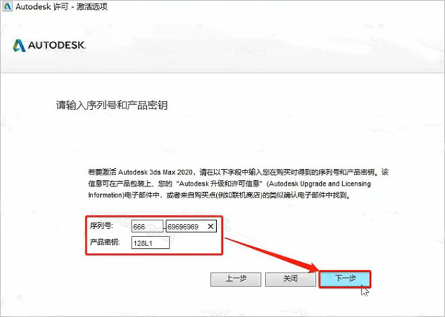 8、输入序列号【666-69696969】,输入产品密钥【128L1】,点击【下一步】