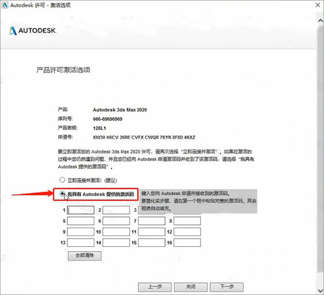 11、点击【激活】重新输入序列号密钥,选择【我具有Autodesk提供的激活码】(不要关闭此界面)