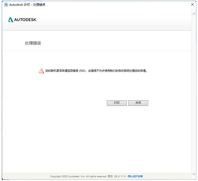 9、如果出现【您的联机激活申请返回 500,此错误不允许我们的自动系统处理您的申请】,请卸载AdskLicensing,再重装AdskLicensing;