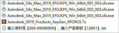 1、下载解压,得到autodesk 3ds max 2019简体中文版、注册机以及序列号和密钥;