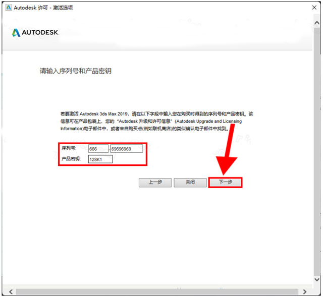 9、输入3dmax2019序列号“066-066666666”,输入密钥“128J1”