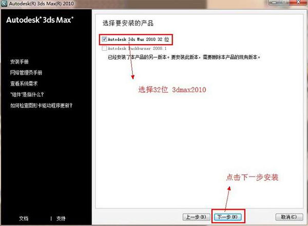 3、这里我们没有多的选择,也没有像别的安装包一样有很多的插件要安装,直接勾选3dsmax2010,点击下一步安装
