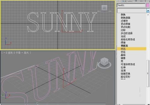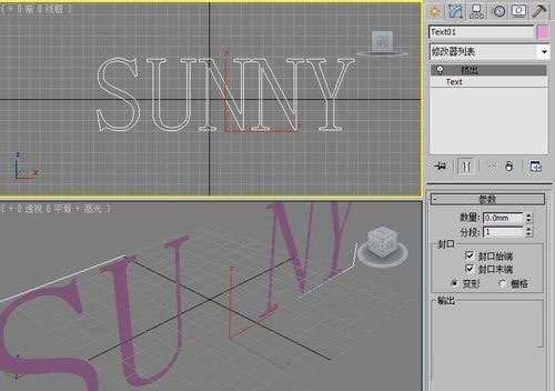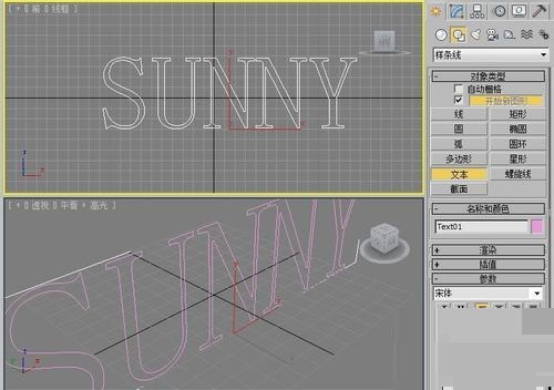 2、在文本框中输入SUNNY文字。并将鼠标在前视图上点击一下。
