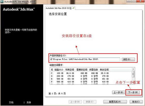 8、3dsmax2010的安装路径,默认下是在c盘符里,这里更改到d盘符,点击下一步继续配置