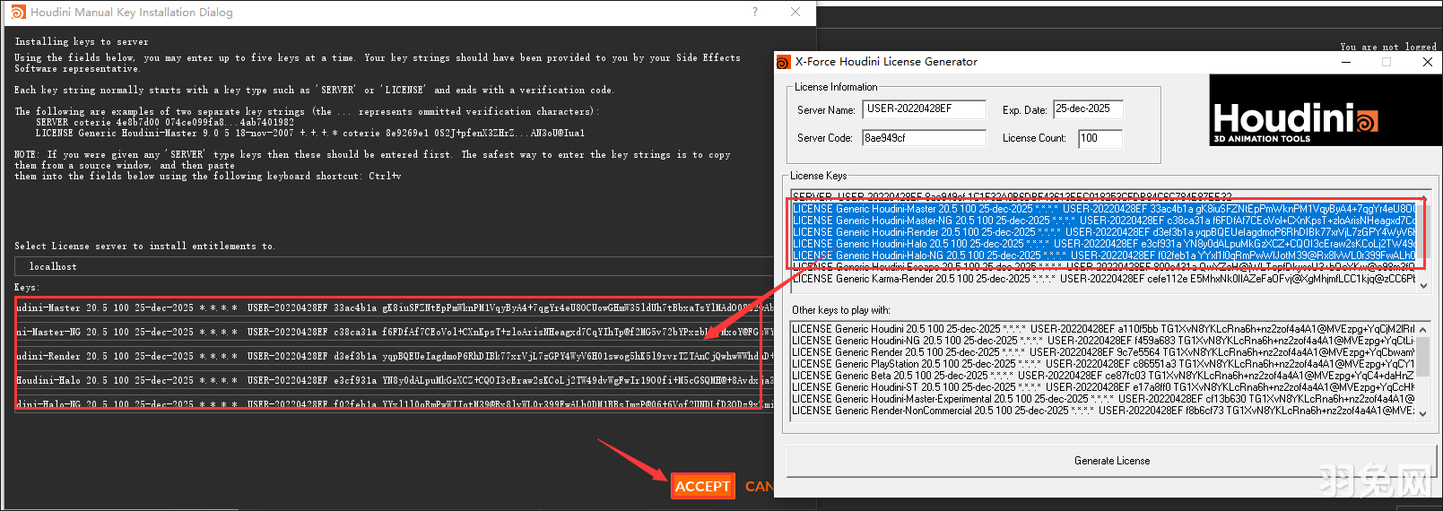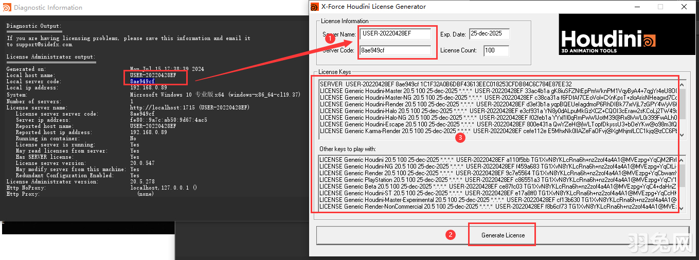 8、打开注册机houdini_21_0_keygen.exe,输入Server Name 和 Server Code,点击Generate Keys生成License;