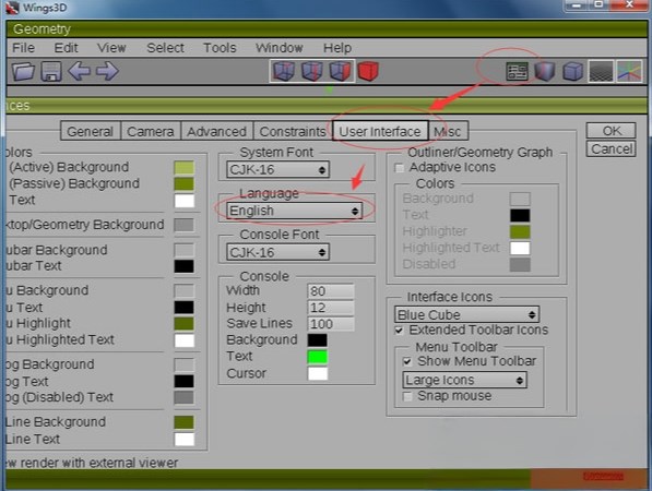 5、Wings 3D默认是英文界面,操作起来还是挺麻烦的,我们可以根据下面图示更改语言选项:
