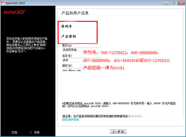 6、输入cad2010的序列号和密钥;使用下列序列号:356-72378422,666-69696969,667-98989898,400-45454545或653-12354321等任意一个产品序列号,产品密钥一律为001B1;