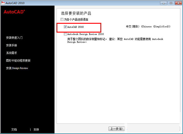 4、默认只安装autocad 2010,autodesk design review 2010可以根据自身的需要选择安装;
