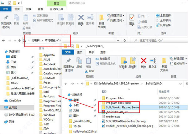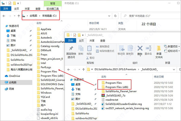 10、安装完成后不要运行SolidWorks,将“Program Files”和“Program Files(x86)”两个文件夹中的破解文件替换对应的文件;
