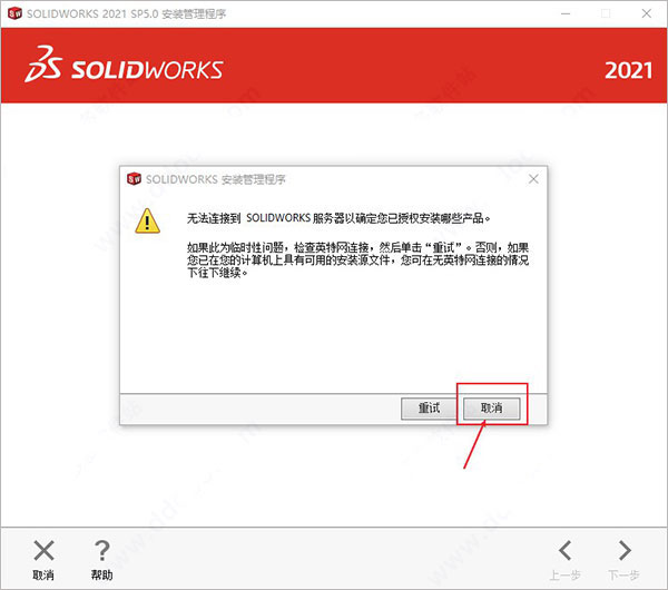 8、提示无法连接网络点击取消按钮后继续安装;