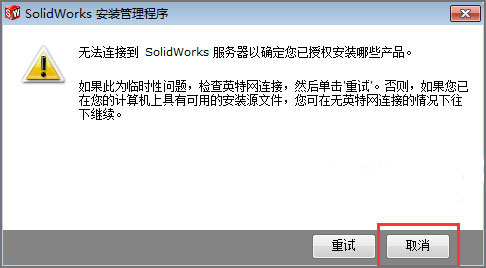 4、由于已经无断开网络,此时会提示你无法连接到Solidworks服务器,点击“取消”按钮