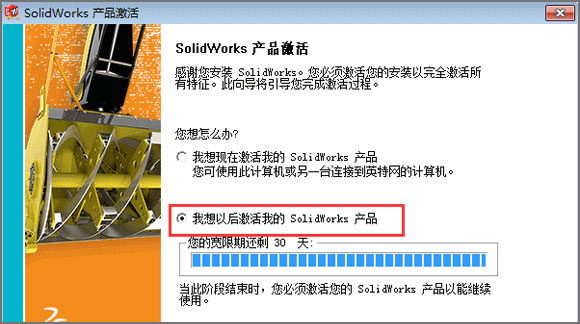 8、此时已经可以进入程序了,打开桌面SolidWorks2012,弹出激活界面,可以看到,此时我们有30天的试用,选择以后激活点击完成