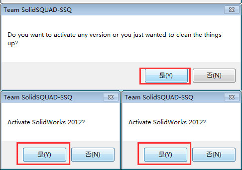 9、关闭SolidWorks2012程序,进入安装包下的“安装指南”文件夹,打开SW2010-2012.Activator.SSQ.exe(WIN7/Vista用户请右击—以管理员身份运行),一路点“是,是,是”即可完成SolidWorks2012的激活。