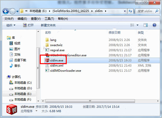 断开网络连接(禁用本地连接或拔掉网线),右键解压本站提供的SolidWorks 2008 32位安装包,打开sldim目录,运行“sldim.exe”