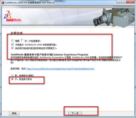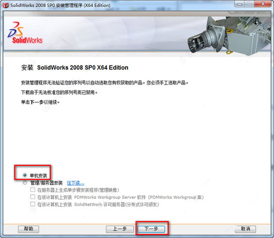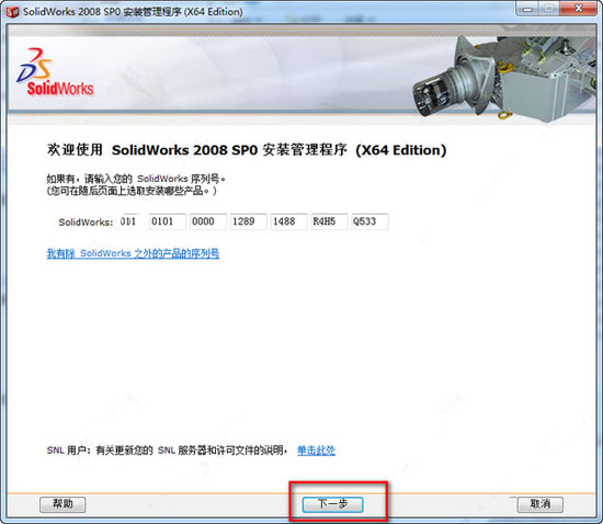 解压完成后弹出安装界面,输入SOLIDWORK2008序列号:0101 000 1289 1488 R4H5 Q533