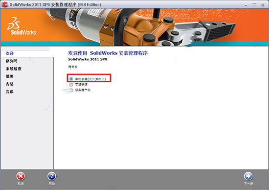 1、下载并解压本站提供的SolidWorks 2011 64位破解版安装包,运行“setup.exe”,选择单机安装