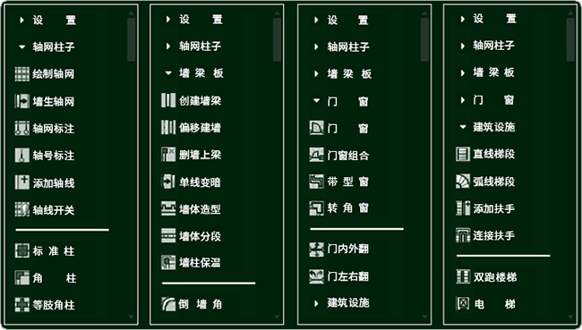 两级折叠式屏幕菜单,层级结构清晰,通过构件分类标签可快速找到所需命令;软件易学易用,设计师可快速上手建筑图纸绘制。