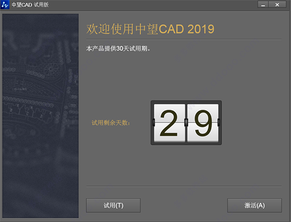 5、这里软件提示中望cad2019试用或者激活,用户可以先试用30天无任何功能限制。