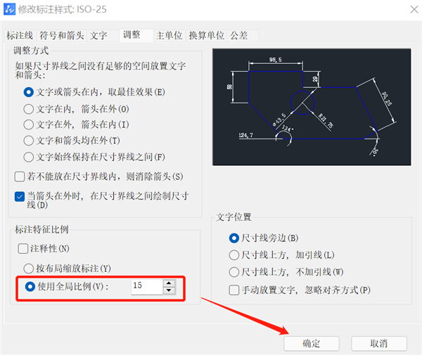 4、在【修改标注样式】对话框中选中【调整】选项卡,选择【使用全局比例】,修改为【15】,设置完成后点击【确定】。