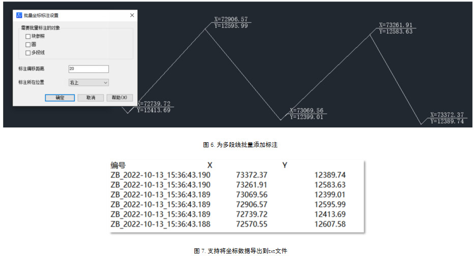 面对需要添加大量坐标标注的设计场景,我们还提供了批量创建坐标标注的功能,目前支持对“块参照”、“圆”、“多段线”三种对象进行批量标注。图纸上的标注数据也支持导出到记事本文件,方便数据的存储与复用。