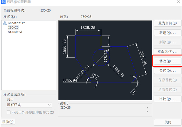 5、回到【标注样式管理器】对话框,点击关闭。此时我们可以看到标注已经变大了,效果如下图所示。