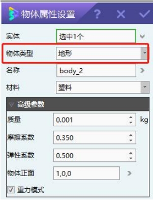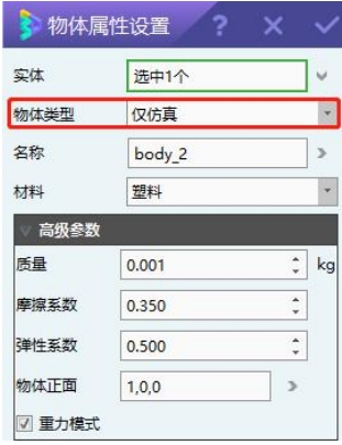 重力模式默认开启,若选择取消,则代表即使在重力场中,该物体仍按照无重力的方式仿真。也可以设置物体的正面;物体类型对物体进行一些特殊设置。物体所有参数均可按照物体的实际物理意义进行设置。