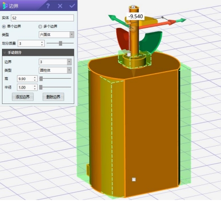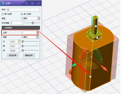 - 比如,第三个划分边界为六面体,与原有物体的几何形状不太接近,可以下拉【边界】框改为 3,将类型改为圆柱体,就可以对第三个边界进行大小和位置的调整。也可以同时选中多个物体进行划分的功能,减少用户的重复操作。