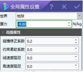 - 如图一,在全局属性设置中 ,世界属性模拟仿真的环境,匹配了该真实环境下的一些参数信息。世界属性改变,一些默认参数也相应地改变。如地球属性下,重力值默认为-9.8,范围从负无穷到正无穷,负号代表重力方向垂直地面方向向下,正号代表垂直地面方向向上。