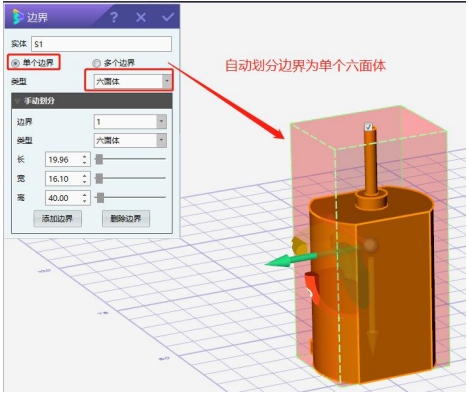 - 点击左侧工具栏的第四个按钮 即可开始对物体进行边界划分。 选择了需要划分的物体后,默认先进入自动划分。可以选择是进行单个边界划分还是多个边界划分,也可以选择划分类型是六面体、圆柱体还是球等。当选择多个边界划分时,还要进一步选择划分质量,即将待划分物体具体划分为多少个边界。