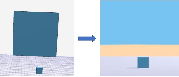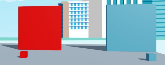 仿真示意图:地形类型与空类型物体在受到碰撞时的仿真对比。如下图所示。左边红墙为空类型,右边蓝墙为地形类型。它们同时受到一个物块的撞击,撞击后可以看到为空类型的红墙倒塌,而为地形类型的蓝墙没有: