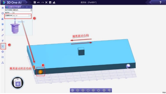 将作为马达的物体选中,设置电子件类型为马达、伺服电机、步进电机、舵机等类型的电子件,方向设置为履带滚动方向的法向方向,遵循右手螺旋定则。